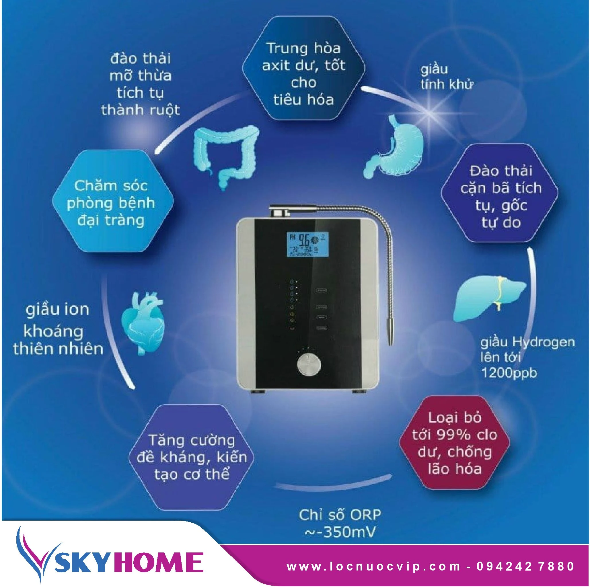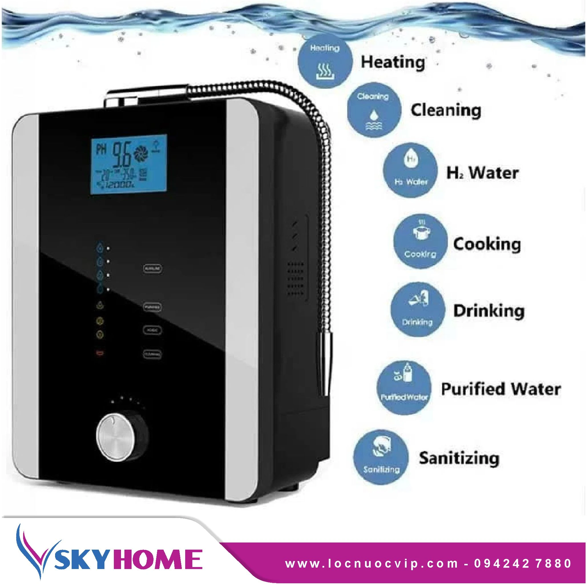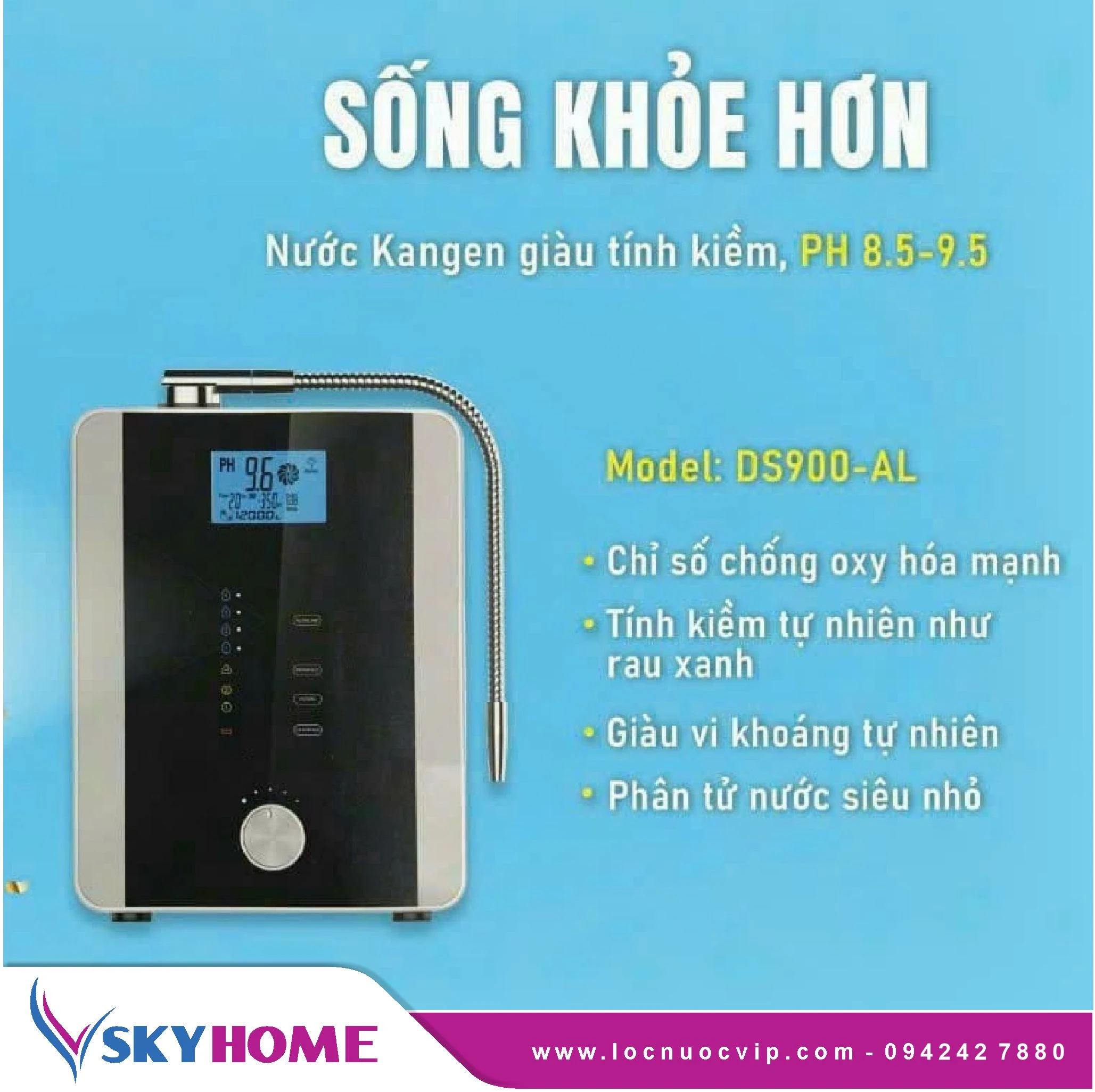 Được phân phối chính hãng bởi SKY Home, sản phẩm này là máy ion kiềm đầu tiên do người Việt chế tạo thành công, tích hợp công nghệ siêu lọc vi sinh NANOTUBE và 7 tấm điện cực Titan phủ Bạch kim, tạo ra nguồn nước với độ pH từ 3.5–9.5, ORP -800 mV, và nồng độ Hydro lên đến 1500 ppb.