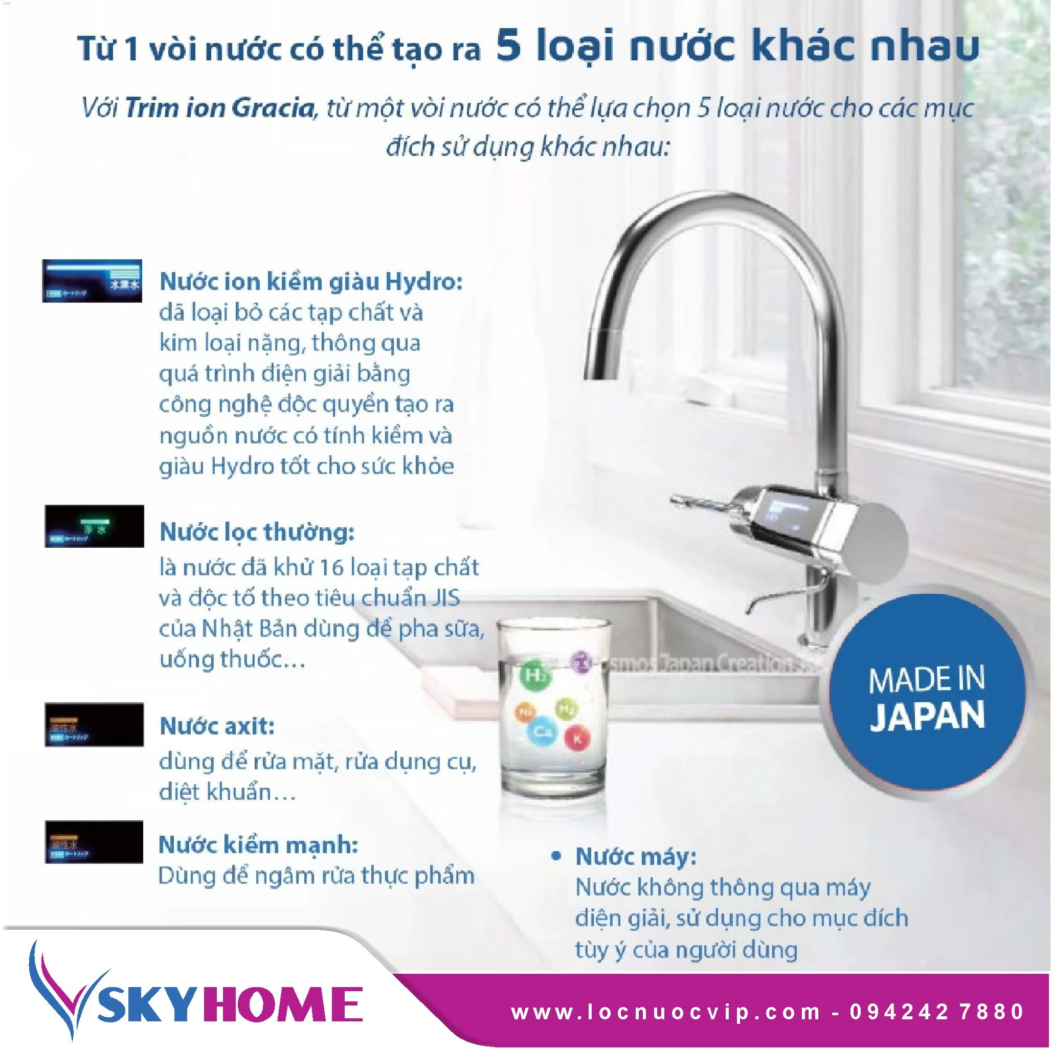Máy có khả năng tạo ra 5 loại nước chức năng với dải pH từ 3.0 đến 10.5, đáp ứng đa dạng nhu cầu sử dụng: